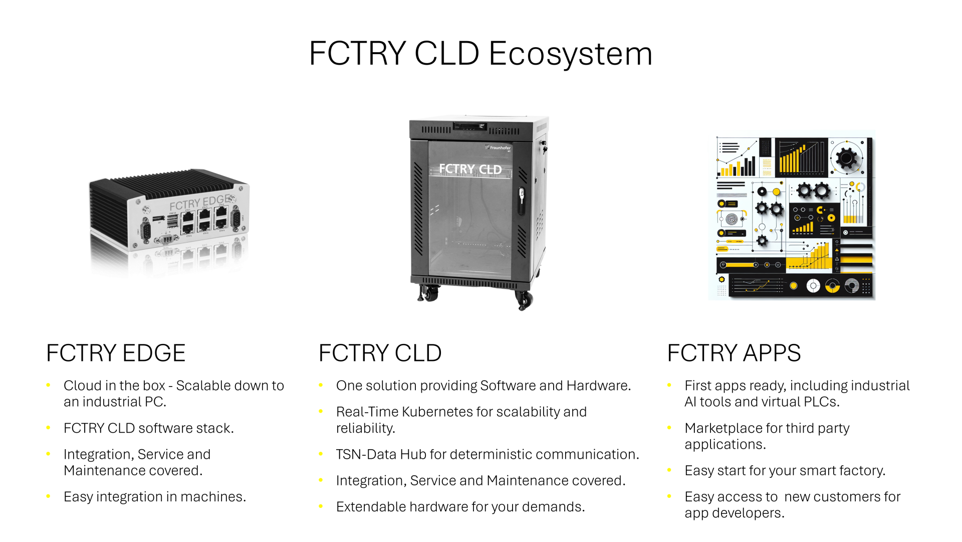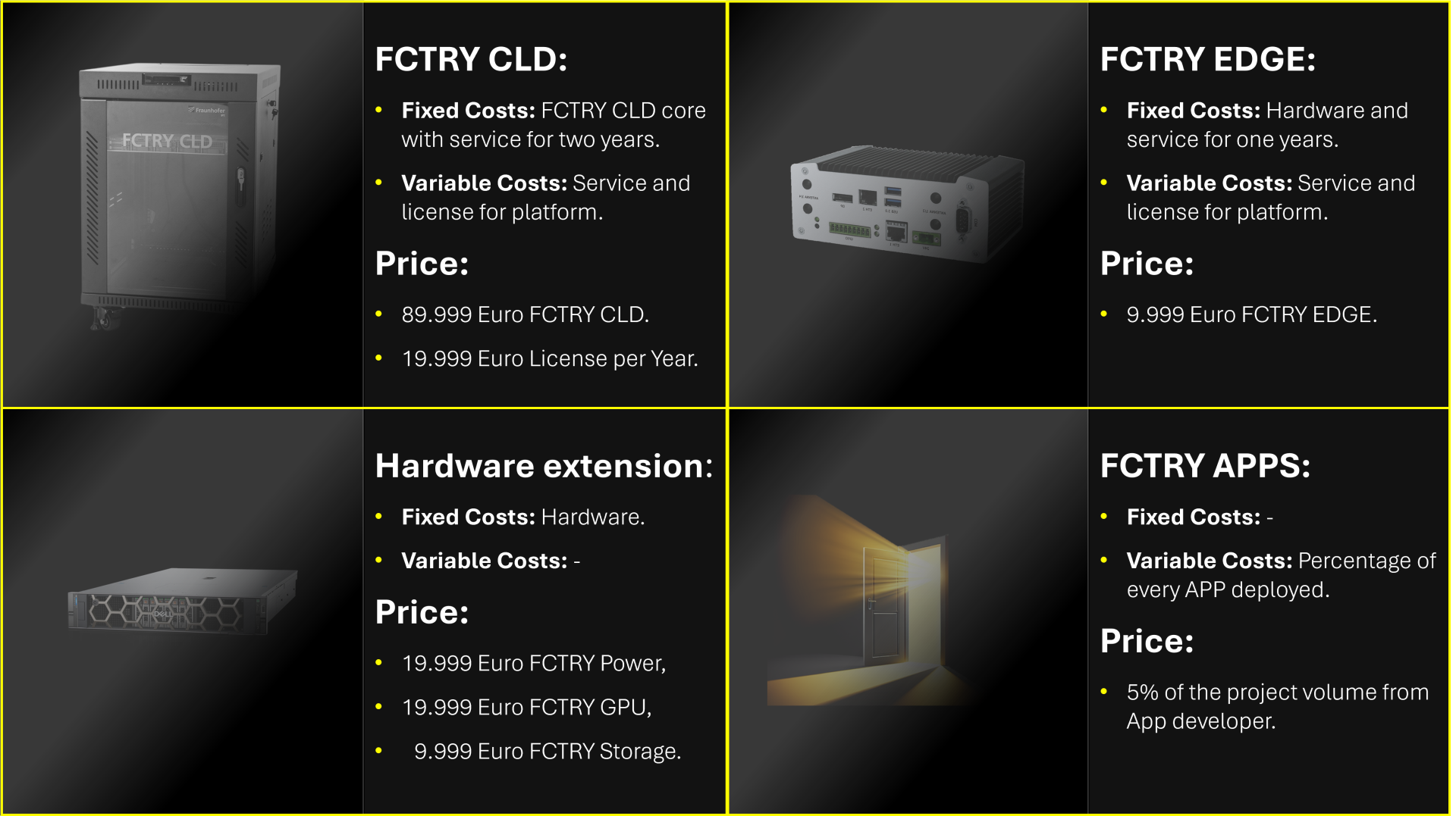 Mit der FCTRY CLD und der FCTRY EDGE werden Unternehmen ein schneller Einstieg in die Digitalisierung ermöglicht. Diese werden als Komplettpaket verkauft, mit Lizenz- und Service-Gebühren für die ersten zwei Jahre. Nach dieser Zeit können die Lizenz- und Service-Verträge erweitert werden. Unternehmen können die Fähigkeiten der FCTYR CLD und der FCTRY EDGE durch Hardware Extensions erweitern. Ebenso können Unternehmen FCTRY APPS installieren um erste Anwendungen zu starten.Highlights