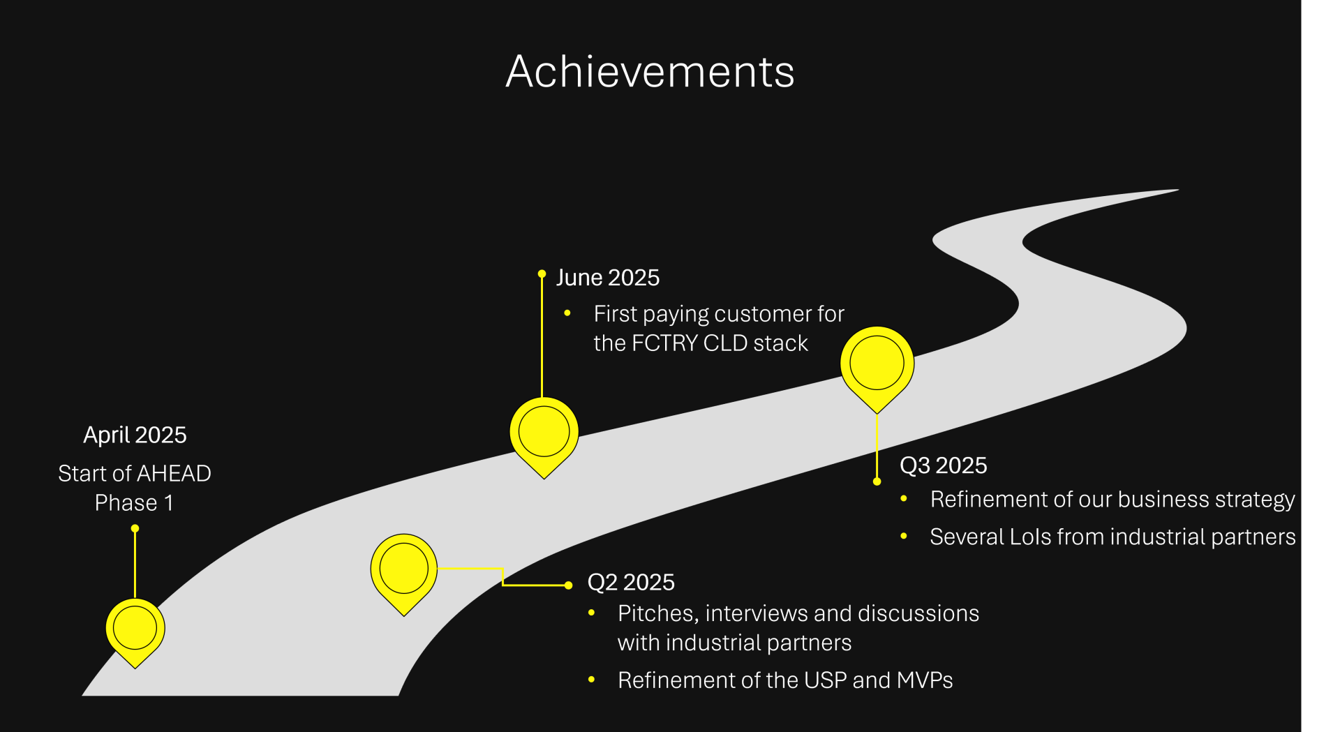 - Mit der AHEAD Phase 1 startete Anfang 2025 eine spannende Zeit. Ein besonderes Highlight war die Akquise des ersten Kunde im Juni 2025: In einem gemeinsamen Pilotprojekt konnten wir die Echtzeitfähigkeit und Zuverlässigkeit des FCTRY CLD Stacks direkt in der Maschine validieren!