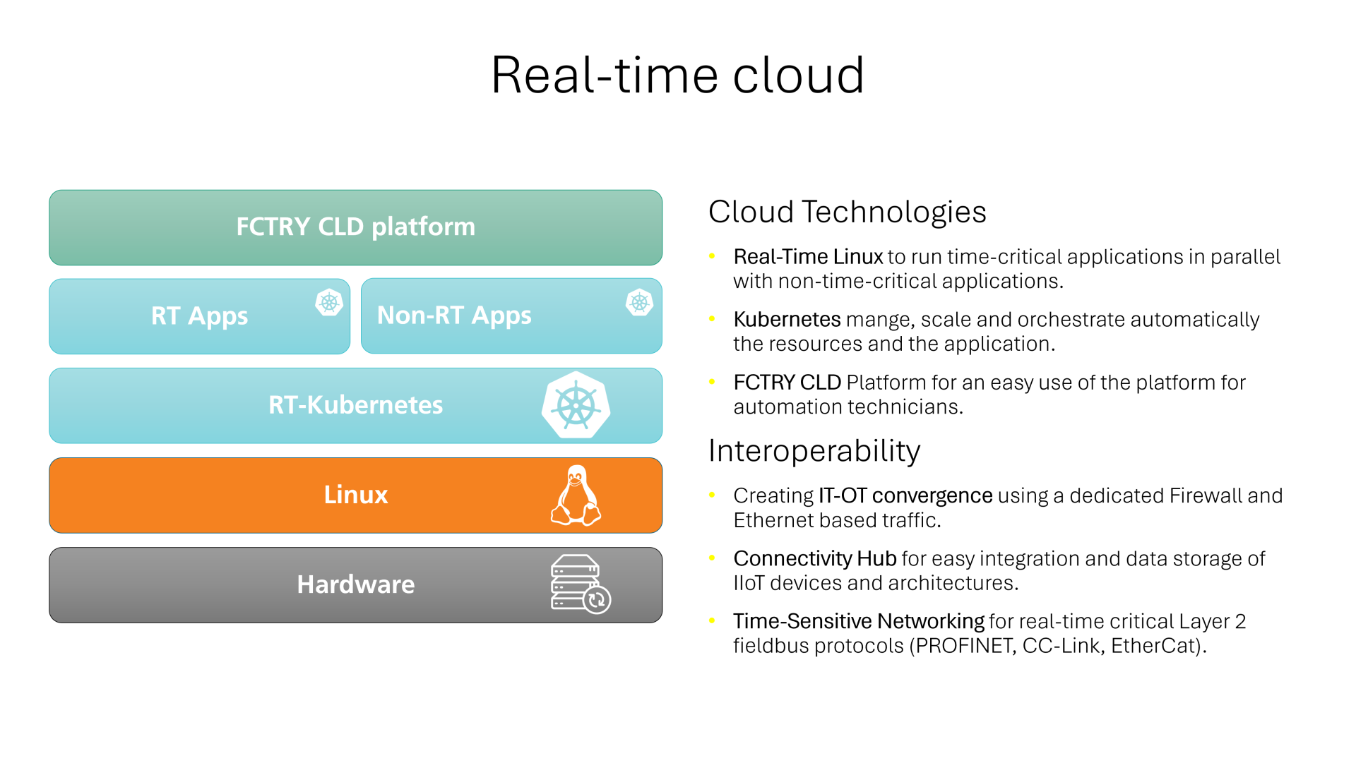 Die FCTRY CLD verfügt über ein Infrastruktur‑Backbone auf Basis von Kubernetes, dem De‑facto‑Standard im Cloud‑Computing zur Verwaltung von Anwendungen und Infrastruktur. Wir haben eine echtzeitfähige Kubernetes-Distribution entwickelt, die Echtzeitanwendungen von Nicht‑Echtzeit‑Anwendungen trennt und Ausführungszeiten für Anwendungen unter bis zu 1 ms garantieren kann.Die FCTRY CLD kann in Echtzeit über Time‑Sensitive Networking (TSN) kommunizieren und unterstützt Kommunikationsprotokolle auf höheren Layer. Durch die Plattformlösung werden Rechen- und Netzwerkressourcen optimiert und konfiguriert und eine deterministische Datenübertragung bis zur Maschine gewährleistet. Beispielsweise können Ethernet-basierte Feldbusprotokolle wie EtherCAT, Profinet und Modbus können genutzt werden um zeitkritische Steuerungsanwendungen zu bedienen.