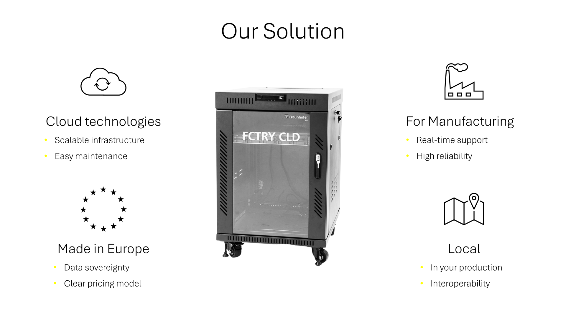 Die FCTRY CLD wird lokal in die Produktion integriert und bietet dadurch bereits eine hohe Datensouveränität. Die FCTRY CLD verfügt, wie die meisten Cloud‑Lösungen, über einen Open‑Source‑Software‑Stack, der auf Kubernetes und OpenStack basiert. Im Unterschied zu anderen Cloud‑Lösungen wurden jedoch Erweiterungen entwickelt, um industrielle Anforderungen wie Echtzeitfähigkeit und hohe Zuverlässigkeit zu erfüllen.Derzeit werden in der Produktion kleine Industrie‑PCs zur Ausführung von Echtzeitanwendungen eingesetzt. Die FCTRY CLD bietet dieselben Funktionen, jedoch mit Cloud‑Eigenschaften wie Skalierbarkeit, Wartbarkeit und hoher Sicherheit. Der Kunde kann seinen Rechenbedarf einfach anpassen und ist nicht an isolierte, im Shopfloor verteilte Lösungen gebunden. So werden Abhängigkeiten zu veralteter Hardware oder internationalen Cloud-Anbietern aufgelöst.