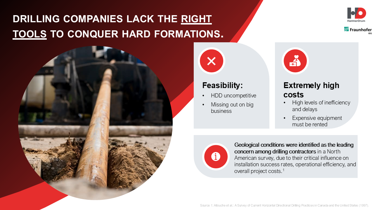 Horizontal Directional Drilling (HDD) is critical for modern infrastructure, enabling trenchless installation of pipelines, cables, and utilities. But in hard rock or mixed soils, performance drops drastically: drilling speed slows by up to 90%, tool wear skyrockets, and fluid consumption increases. Contractors face major financial risks because projects are priced per meter — every slowdown erodes margin. Existing solutions, like mud motors and pneumatic hammers, were adapted from oil & gas and are not purpose-built for HDD.Lösung