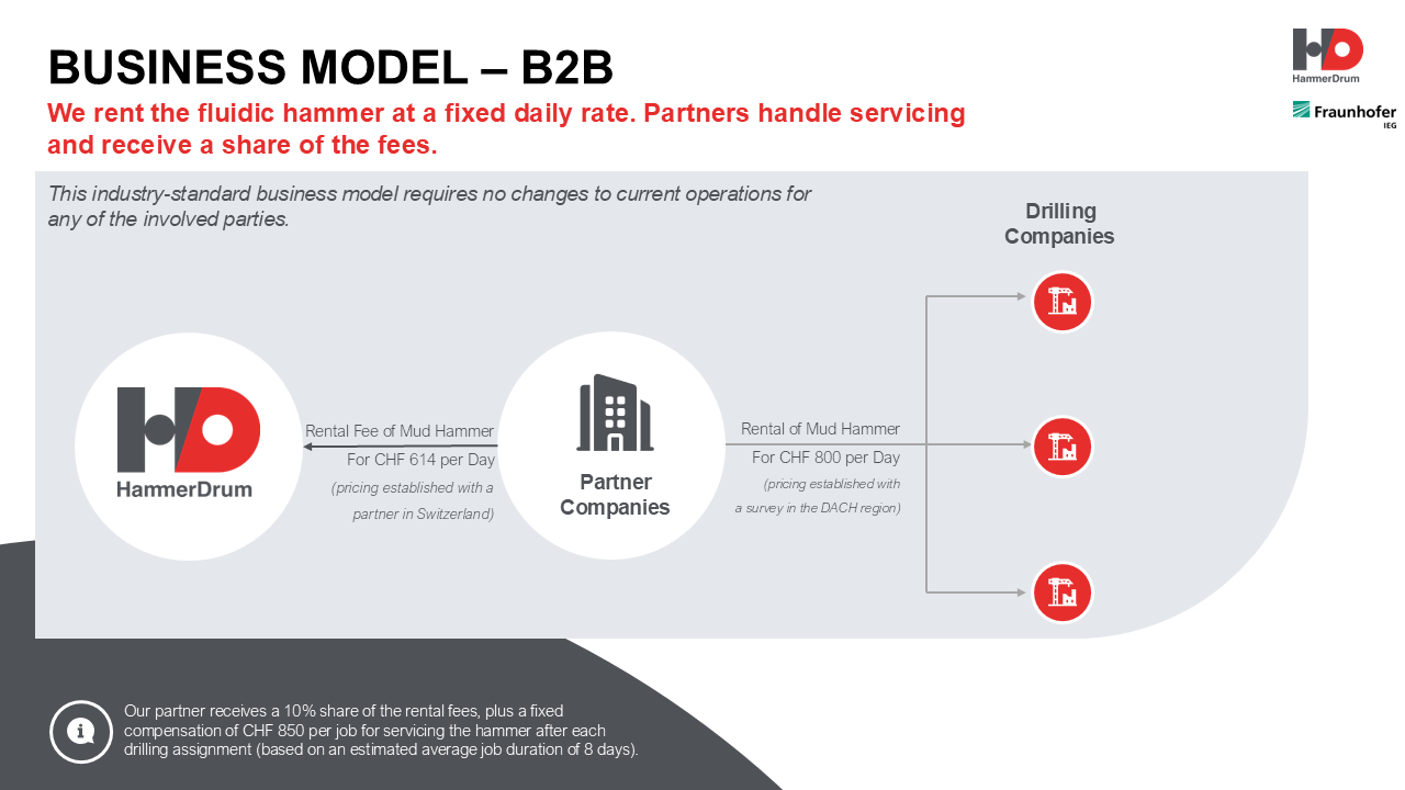 HammerDrum rents its proprietary fluidic hammers to HDD contractors at CHF 800/day via regional distribution partners. With unit costs below CHF 20,000 and utilization of just 50% (130 days/year), each hammer generates CHF 104,000 in annual revenue and CHF 65,000 in gross profit. Payback is under 50 days, delivering a 3-year ROA of 842%. Partners handle logistics, service, and customer support, earning a 10% commission. This capital-light, recurring rental model ensures rapid scalability, predictable revenues, and strong margins, with optional expansion into direct sales and licensing once adoption is established.Traction / Highlights