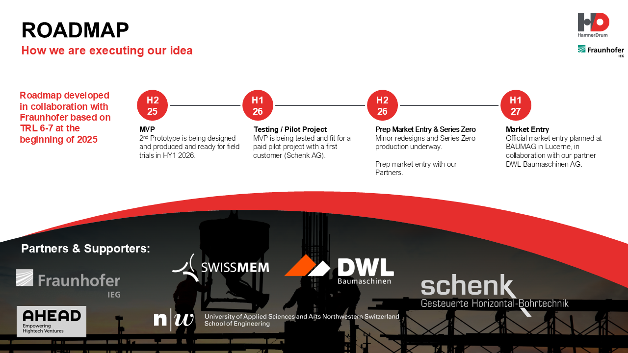 Our first customers are small and medium-sized HDD contractors that rely on rentals due to limited capex, making them early adopters. Five pilot customers in Switzerland and Germany have signed LOIs, committing to test the technology in 2026 projects. Large contractors that are operating across Europe, represent long-term buyers once the technology is proven. Regional sales and service partners ensure market coverage, access to established customer bases, and fast adoption in the DACH region before expanding across Europe and into the U.S.Team