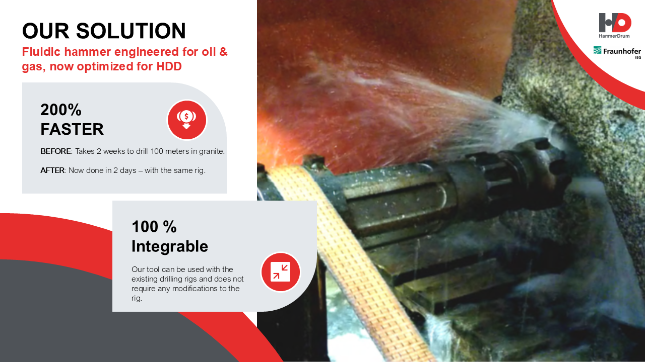 Our patented Fluidic Hammer is a compact, wear-resistant, fluid-driven tool built for reliability in harsh conditions. Its innovative design eliminates moving mechanical parts in the hammer mechanism, using fluid dynamics (Coandă effect) to generate powerful percussive energy. Field tests in granite achieved penetration rates of 15 meters/hour versus 3 meters/hour with mud motors. The hammer is rentable for CHF 800/day, offering contractors low entry barriers and attractive ROI. With a manufacturing cost below CHF 20,000 and a 3-year lifecycle, each unit delivers exceptional return on assets (>200% annually). Scalable across HDD, tunneling, and civil engineering markets, the HammerDrum system is positioned as a disruptive technology in a multi-billion-dollar drilling industry.Alleinstellung