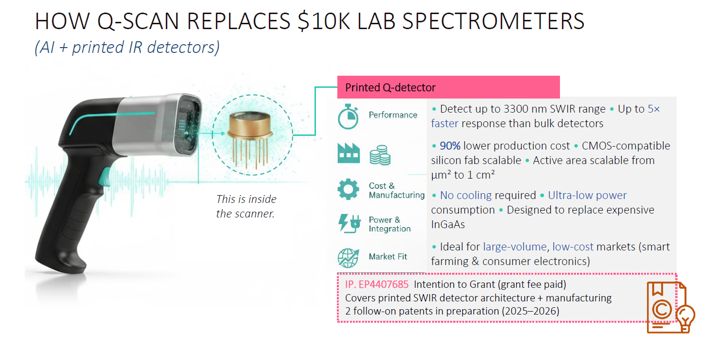 Serino follows a B2B model built around its printed quantum-dot SWIR sensor platform. The company commercializes the technology in two ways: (1) by selling printed SWIR sensor components/modules to OEMs and system integrators, and (2) by offering the Q-Scan material analyzer as a turnkey device for end users who want immediate measurement capability.Highlights