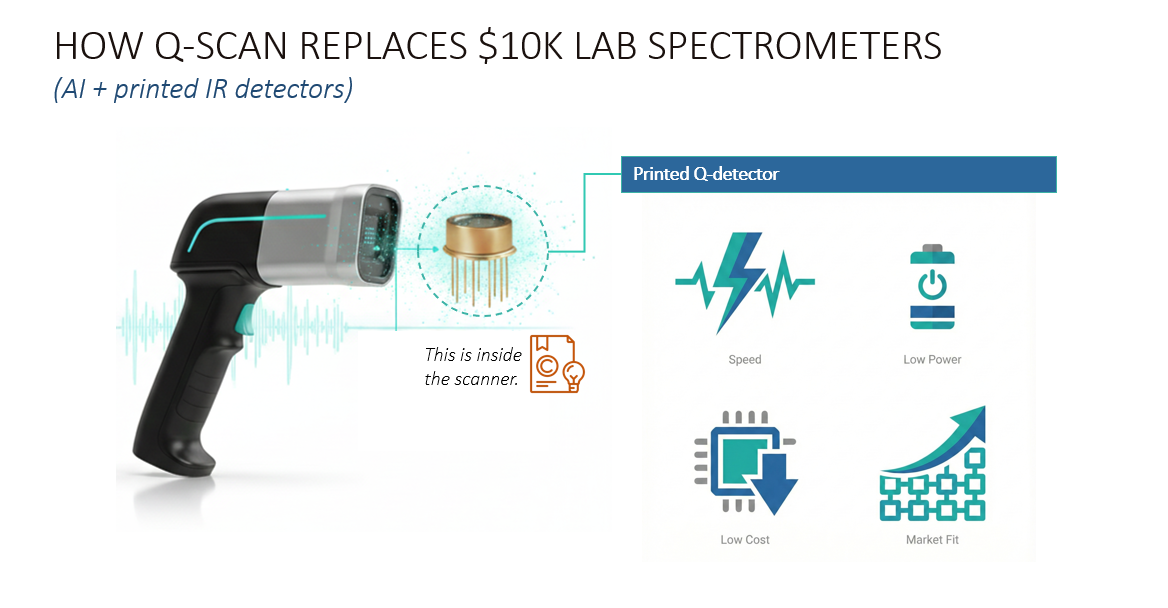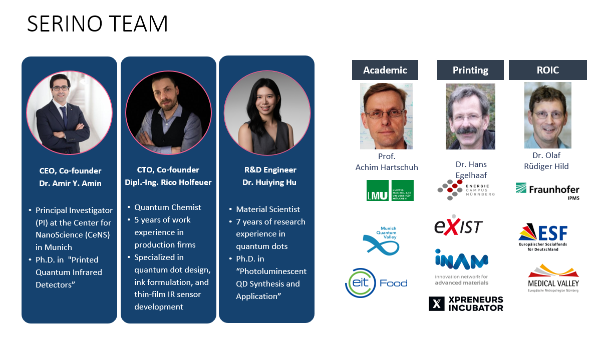Serino is a team that combines scientific leadership with hands-on engineering, with expertise in quantum dot design and synthesis, semiconductor ink formulation, printing-compatible materials, and thin-film infrared sensor development. Backed by an extended network of advisors across academia, printing, and applied R&D, Serino accelerates the path from lab innovation to scalable products.Call to Action: Productize Q-Scan into a Field-Ready Handheld + SaaS Platform