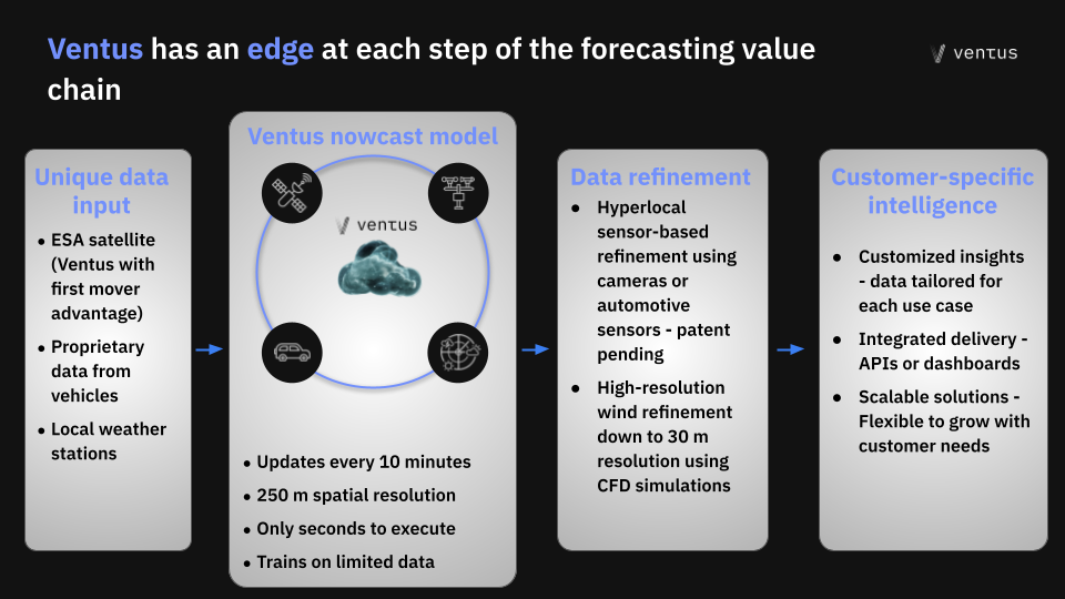 Further, we build upon our track record in delivery of weather forecasts to corporate customers. We tune our models to have top performance on the KPIs that really matter to each specific customer type. On top of the models, we have a patented approach for further refinement of forecasts based on sensor data fed back by edge devices in vehicles or in other customer-side hardware