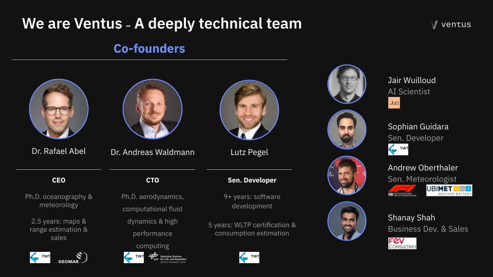 We are a three-person founding team: Rafael Abel (PhD meteorology, industry experience in as project lead in automotive and data engineering), Lutz Pegel (environmental engineer, software dev with automotive background), Andreas Waldmann (PhD in aerospace engineering, aerodynamics and simulation tech background). We have been working together on automotive projects and recognized the need for superior weather data for the mobility sector, leading to the founding of Ventus. We have since grown to include more diverse people, with software engineering, meteorology and business development backgrounds.Our employees come from a wide range of professional backgrounds and experiences, with a spectrum as wide ranging as from Formula 1 race weather analysis and to bleeding-edge AI weather model development. This interdisciplinary nature of our team and our continued ability to attract smart and motivated people is key to our success.